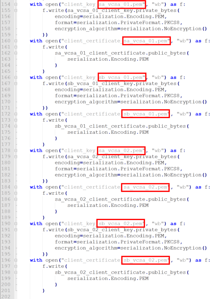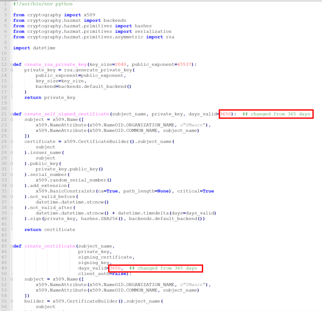 The python script create_certificates.py can be modified to increase the default expiry period, change the client names, and change the organization name in the server and root certs. Edit the file and change the following highlighted values: