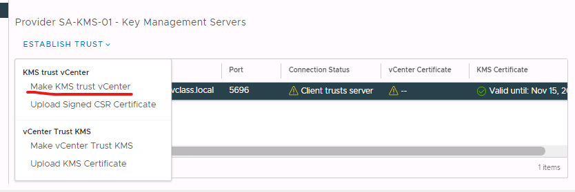 • Click ESTABLISH TRUST > Make KMS trust vCenter.