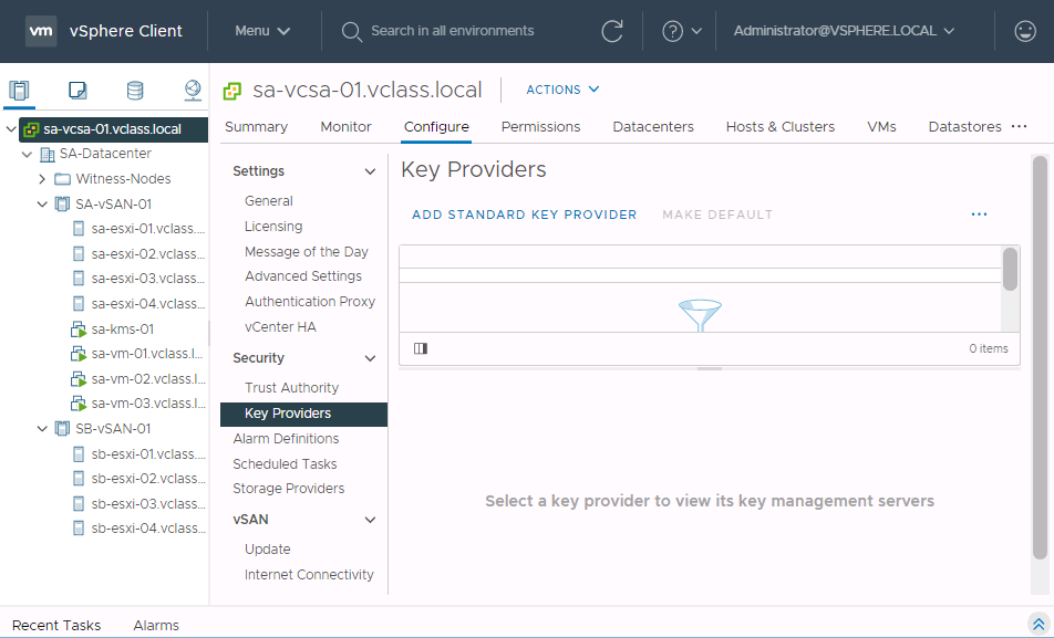 • Click on the vCenter Server object in the vSphere UI and click Configure > Security > Key Providers.