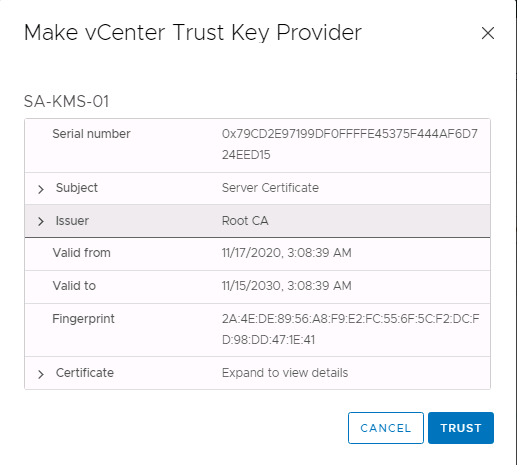 • The PyKMIP should reply with its server certificate, which vCenter must add to its trusted certificates list to allow vCenter to trust the KMS. In the Make vCenter Trust Key Provider window, click TRUST.