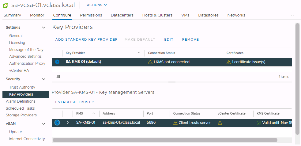 • Next, we must install the client certificate on the vCenter Server that the PyKMIP will trust. In the Key Providers panel, select the radio buttons in both the Key Provider and Key Management Servers panels called SA-KMS-01. You can see that the trust is halfway established as the Connection status shows ‘Client trusts server’.