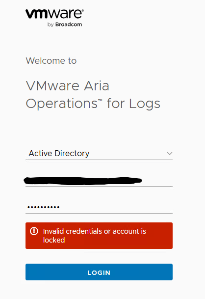 However, when I tried to log in with my domain user account, which is a member of the Aria OPerations for Logs administrators group in AD, I was getting an ‘Invalid credentials or account is locked’ error message.