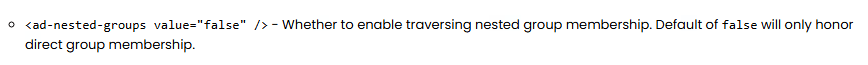 <ad-nested-groups value="false" />to<ad-nested-groups value="true" />. - Click SAVE.