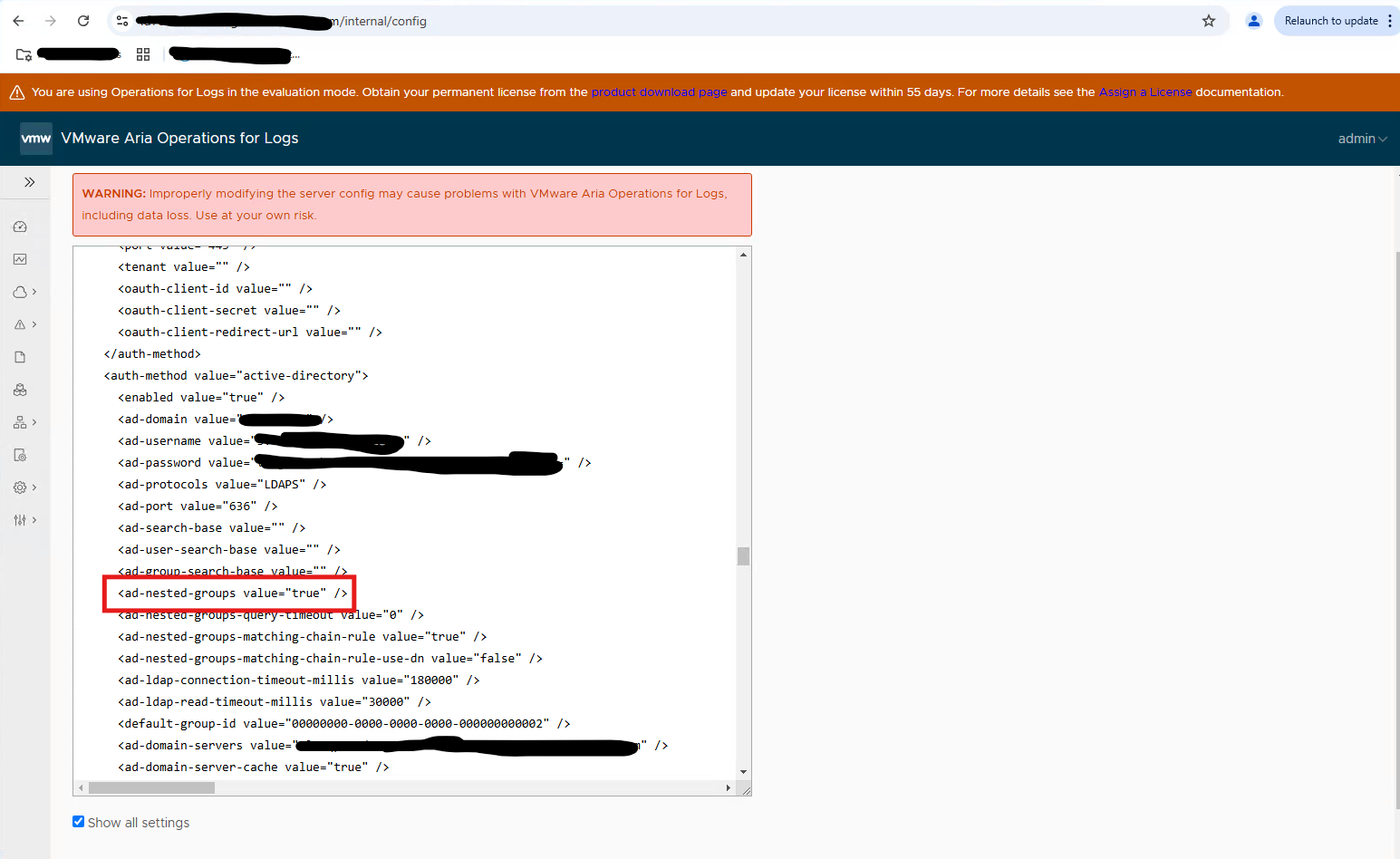 To change this default behaviour to allow users from nested groups to be discovered by Aria Operations for Logs, you must change this value through a special URL which presents an XML representation of the configuration of Aria Operations for Logs at https://<FQDN_of_Aria_Operations_for_Logs>/internal/config.